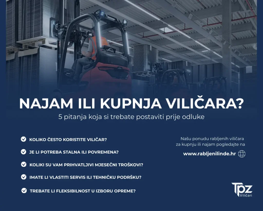 Ako godišnji trošak najma prelazi 40–50 % vrijednosti viličara, kupnja – posebno rabljenog viličara – najčešće postaje isplativija opcija.